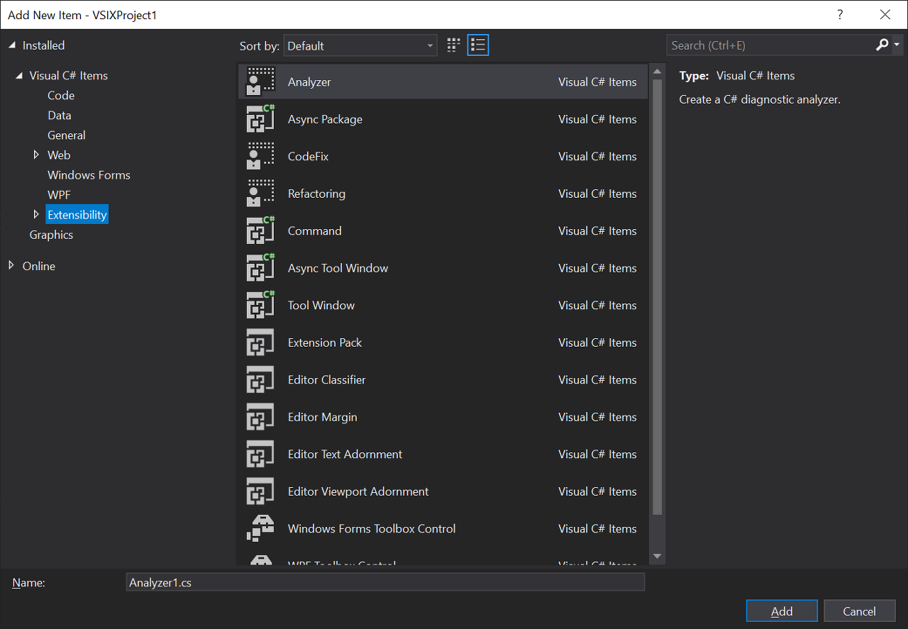 좌측 메뉴의 Visual C# Items 템플릿 중에서 Extensibility 카테고리에서 제공하는 아이템들을 사용할 수 있습니다.