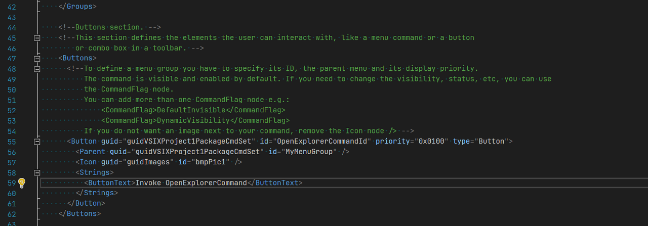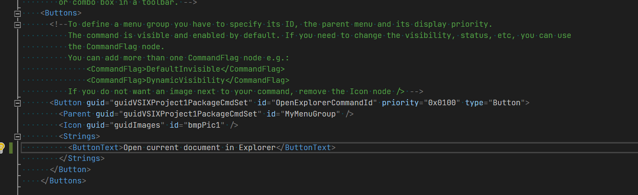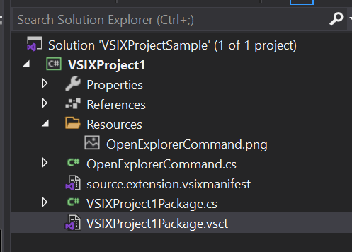 메뉴 아이템에 노출될 버튼의 이름을 변경해보겠습니다. 솔루션 탐색기에서 현재 프로젝트에 속하는 파일들 중에 .vsct 확장자를 가진 파일이 있습니다. 이 파일을 수정합니다.