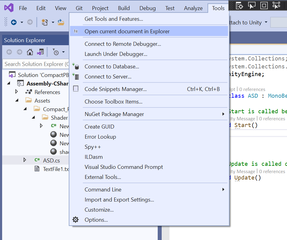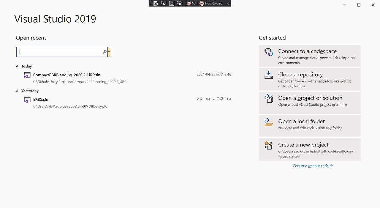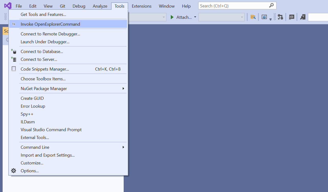 오른쪽 하단의 Continue without code 메뉴를 누르면 아무런 프로젝트로 로드하지 않은 채 빈 비주얼 스튜디오를 열게 되지만 원하는 기능의 테스트는 진행이 가능합니다. 상단 메뉴 아이템들 중 Tools를 확인하면 Invoke OpenExplorerCommand라는 보통의 VS에서는 볼 수 없는 메뉴가 존재합니다.