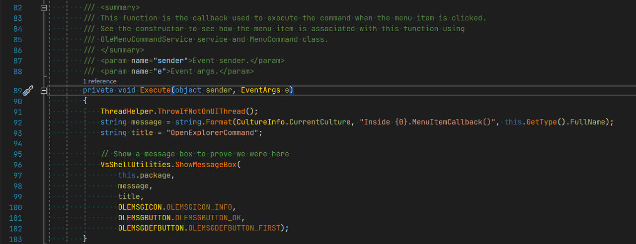 Command 템플릿을 OpenExplorerCommand.cs 이름으로 생성했습니다.