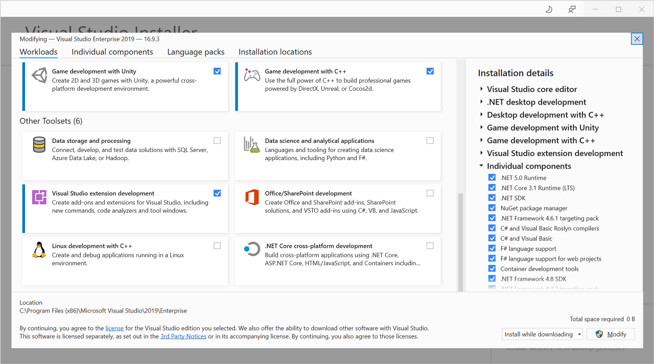 보통 Visual Studio는 개발을 위한 IDE로 사용하므로 확장개발을 위한 SDK를 설치하지는 않습니다. 먼저, Visual Studio Installer를 열어 Extension Development Kit을 설치해주었습니다. 사용하는 버전의 Visual Studio의 Modify 버튼을 눌러 설치된 모듈을 변경할 수 있습니다.