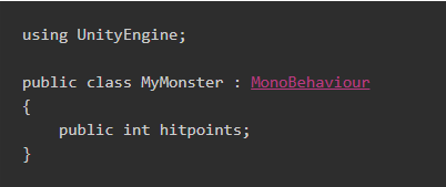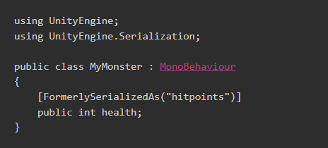 MyMonster 클래스에 hitpoints라는 변수가 있었고, health라는 이름으로 수정했습니다. 하지만 컴퓨터 파일시스템에 저장된 데이터에는 이전 이름인 hitpoints로 저장되어 있습니다. FormerlaySerializedAs(변수명) attribute를 붙여주면, 아직 초기화 되지 않은 health의 값을 가져올 때, hipoints로 부터 값을 읽어들어옵니다.