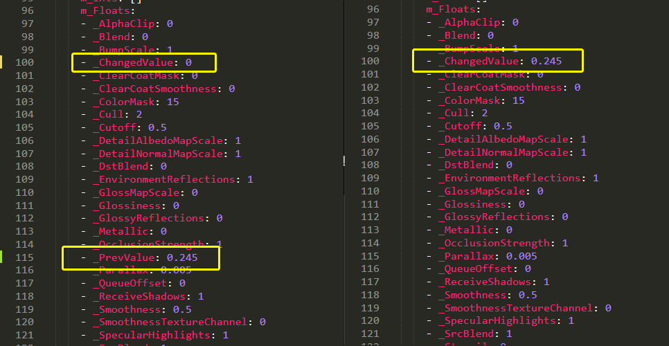 유니티 에디터는 yaml 방식 시리얼라이즈를 사용하고 있어 텍스트 에디터로 *.mat 파일을 열어 값이 전달되었음을 직접 확인해 볼 수 있습니다.