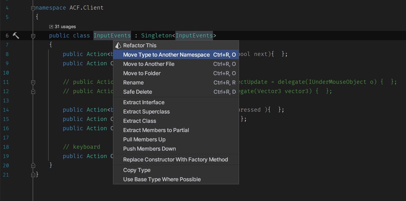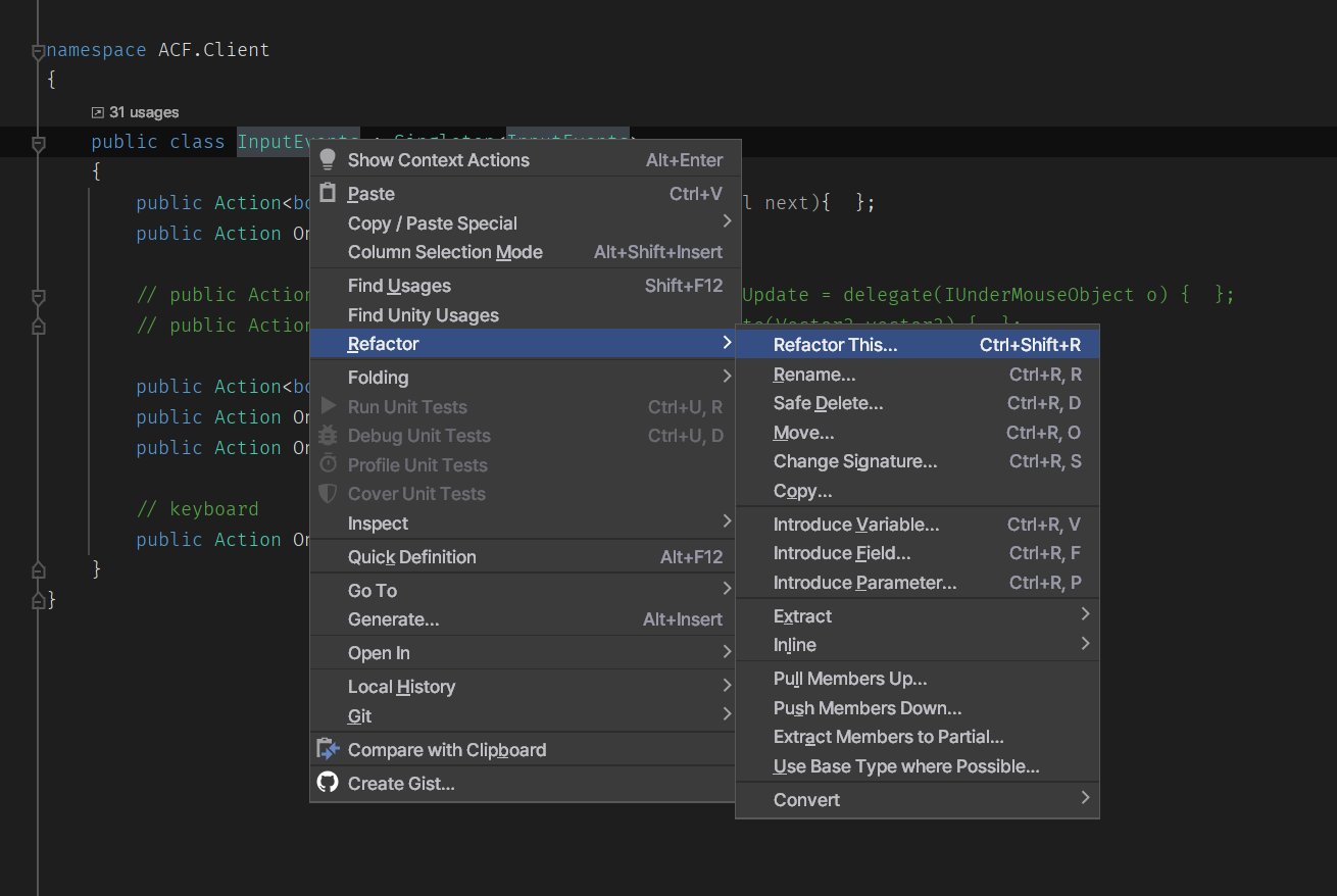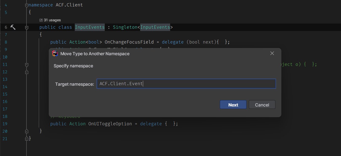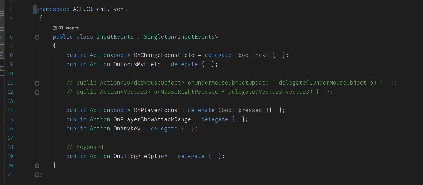 이 InputEvents 클래스는 총 31곳에서 사용되고 있는데, 모두 안정적으로 ACF.Client.Event 네임스페이스가 using으로 추가되었습니다.