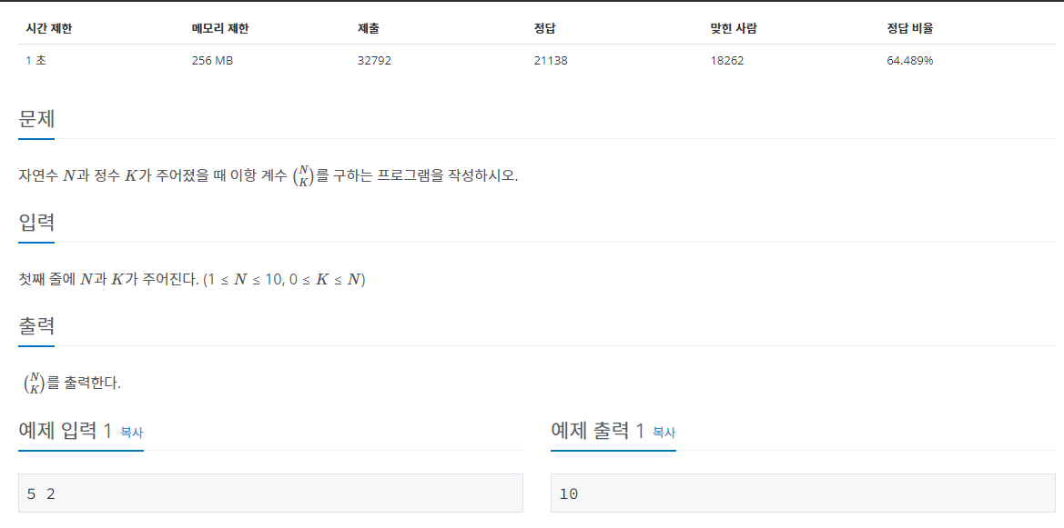 첫째 줄에 \(N\)과 \(K\)가 주어진다. (1 ≤ \(N\) ≤ 10, 0 ≤ \(K\) ≤ \(N\))