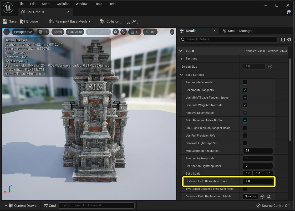 - 메시 디스턴스 필드 해상도는 임포트되는 스태틱 메시의 스케일에 기반하여 지정됩니다. 작은 크기로 임포트한 메시를 스케일을 키워 월드에 배치하면 적절한 해상도의 메시 디스턴스 필드를 갖지 못하게 될 것입니다. 눈에 띌 정도로 유의미하게 인스턴스의 스케일을 조절하여 월드에 배치했다면 해상도 스케일을 바꾸어 적당히 조절하세요.