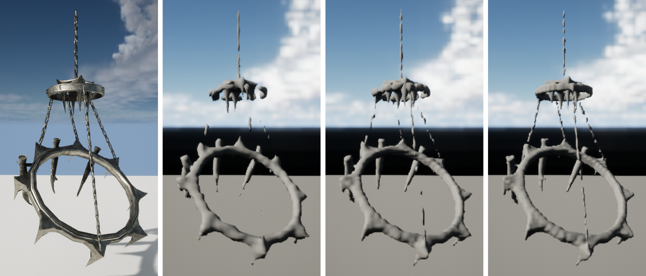 - 디스턴스 필드는 과하게 얇거나 단면 메시의 뒷면을 파악해서 표현하지 못합니다. 단면 메시에서 아티팩트를 피하려면 뷰어가 반드시 트라이앵글의 뒷면을 보지 못하게 하세요.