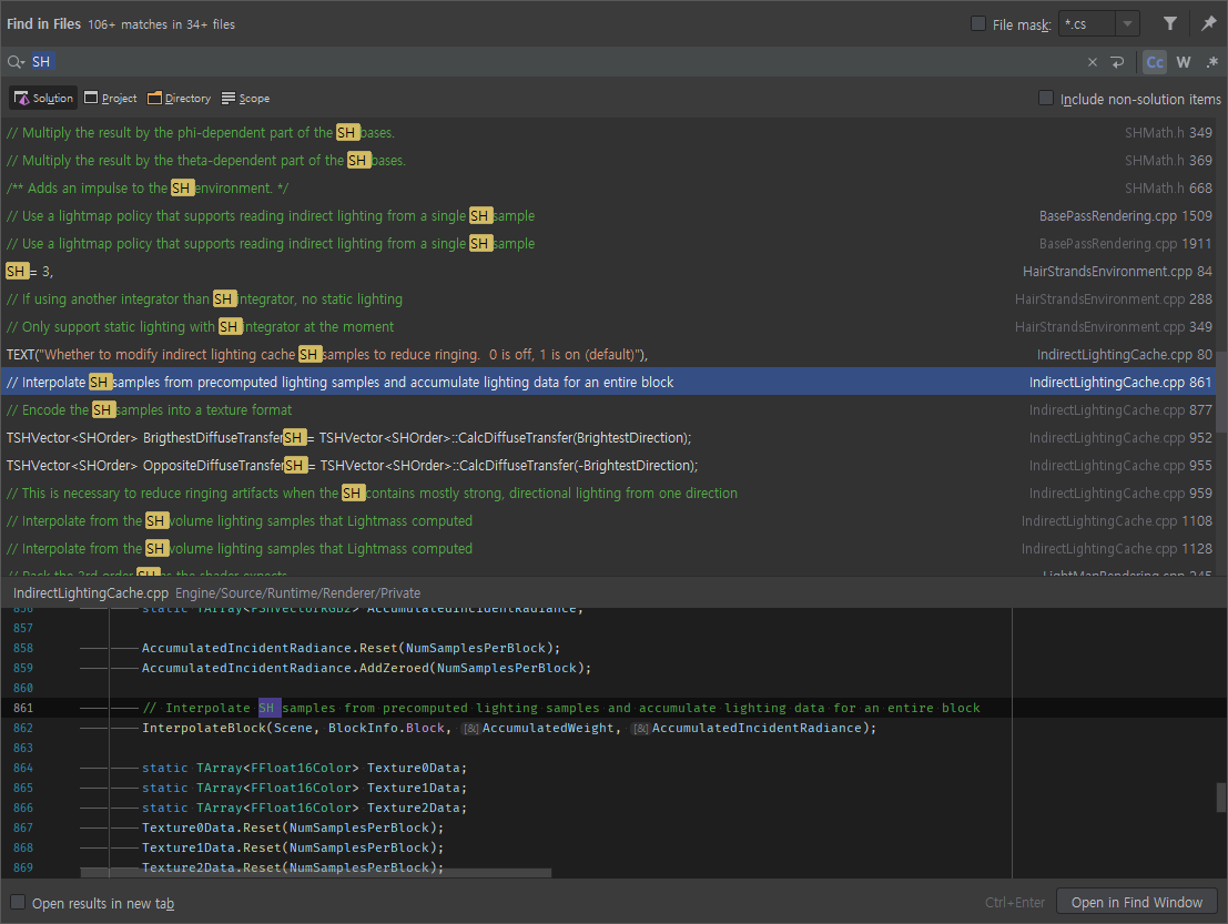이 외에는 Lightmass Smoothing, ScreenSpaceDenoiser, Gaussian 관련 코드에서 직접적으로 이름이 쓰이는 것을 볼 수 있었습니다. SphericalHarmonic으로 검색한거라, 더 자세히 보려면 렌더링 코드 다 따라가면서 SH가 있는지 봐야할 것 같아요.