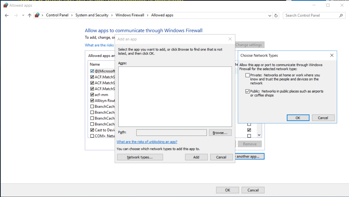 Allow another app... 버튼을 눌러 서버 인스턴스 실행파일을 등록합니다.