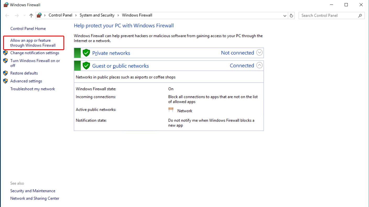 서버 VM에서 firewall 설정을 열고, Allow an app or feature through Windows Firewall 메뉴를 열어줍니다.