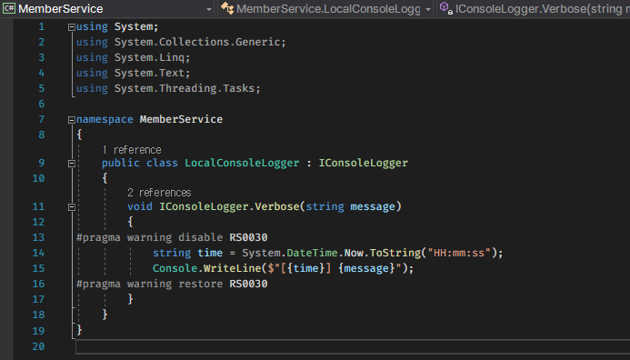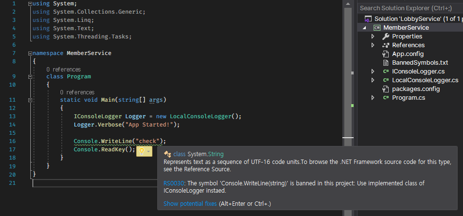BannedSymbols.txt에 Console.WriteLine(string arg1); 심볼을 추가했다.