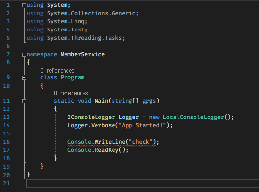 M:System.Console.WriteLine(System.String);Use implemented class of IConsoleLogger instaed.
