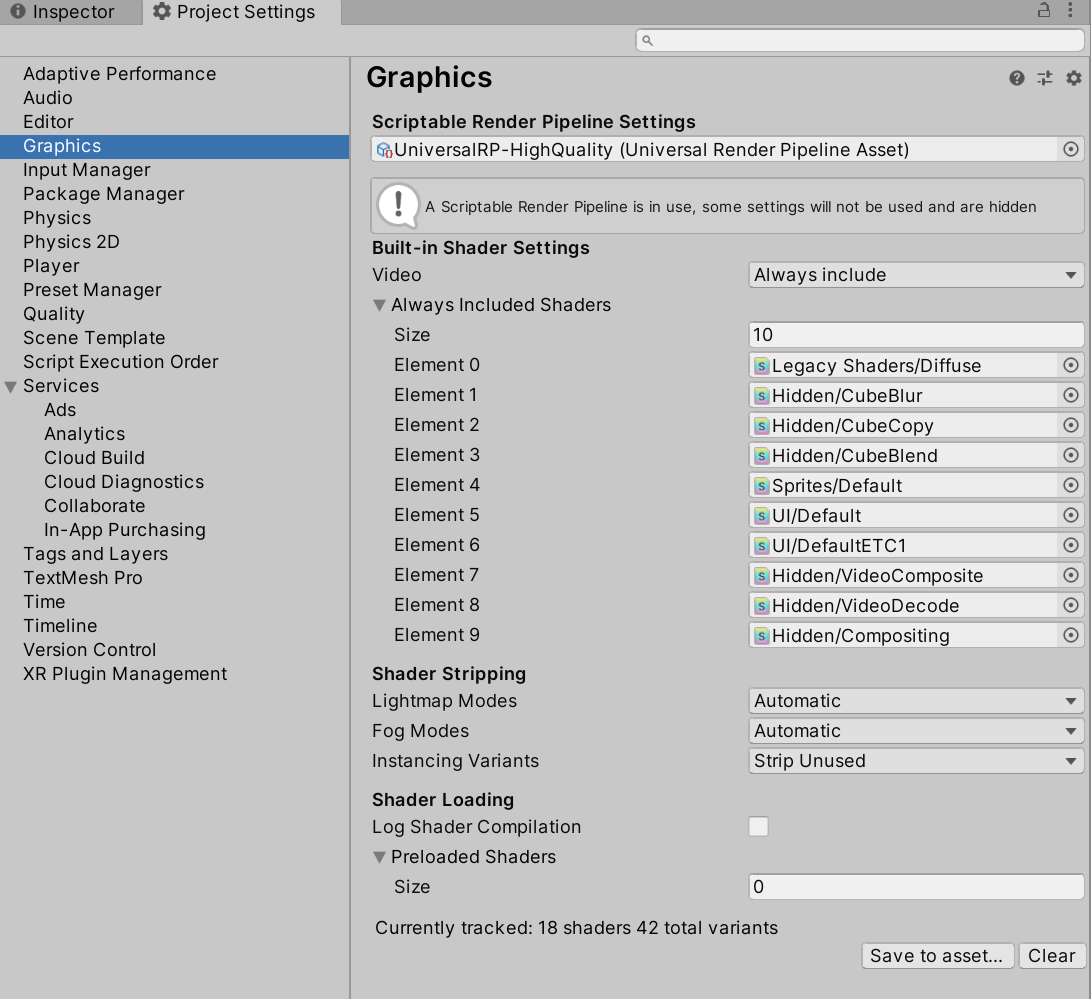 빌트인 렌더러는 렌더링 파이프라인 에셋을 사용하지 않으므로 비어 있다면 빌트인 렌더러입니다.