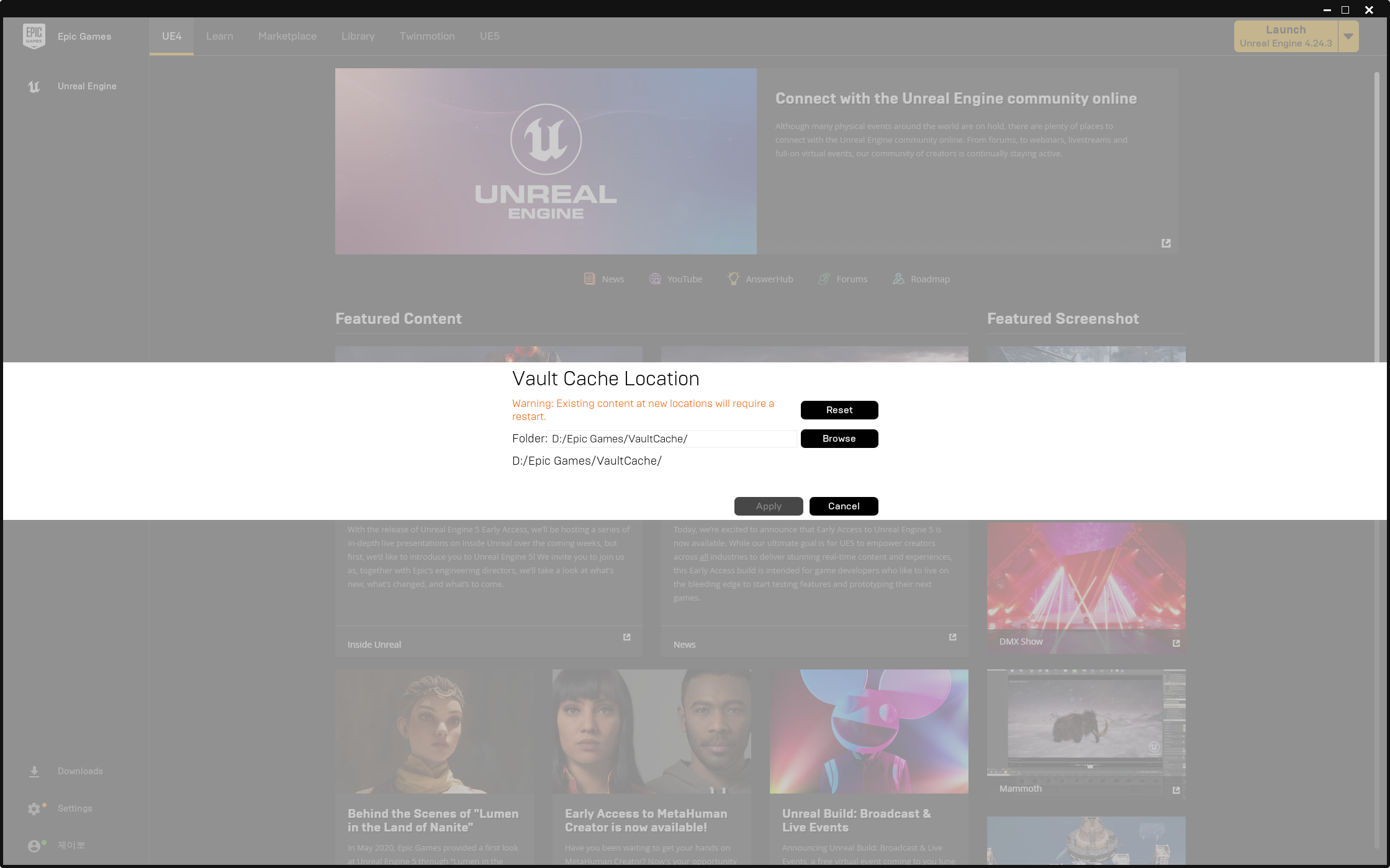 C드라이브는 더 이상 대용량 에셋을 감당할 수 없는 경지에 도달했기에 프로젝트만 C드라이브에 설치하고, Vault Cache는 다른 드라이브에 두기를 원했습니다.