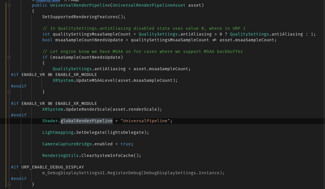그런데 오늘 URP 코드를 둘러보다가 Shader.globalRenderPipeline이라는 string 프로퍼티를 발견했습니다.