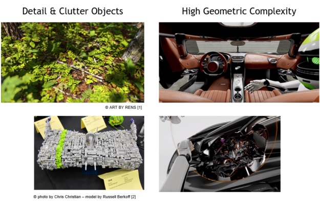 현실 세계는 시각적으로 풍부하고 기하학적으로 복잡한 장소입니다. 특히 야외 씬들은 수십만개의 요소(바위등, 나무들, 작은 식물들, 기타 등등)로 구성될 수 있습니다. CAD 모델은 수 많은 작은 파츠로 만들어진 기계나 복잡한 모양의 표면 모두에 비슷한 문제를 제기합니다.