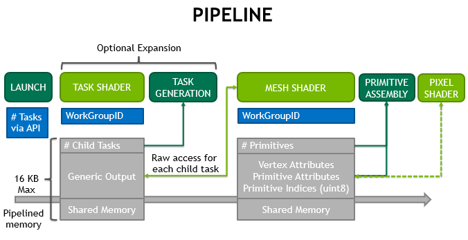 메시 셰이더와 태스크 셰이더는 콤퓨트 셰이더 프로그래밍을 따르며, 결과를 계산 할 때는 작업 그룹 인덱스 외에는 입력을 받지 않는 병렬적인 스레드 그룹을 사용합니다. 이는 그래픽스 파이프라인 위에서 실행되고, 그러므로 하드웨어는 칩에서 직접 각 단계 사이에 메모리를 관리하고 넘겨줍니다.