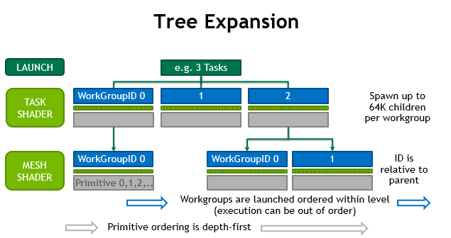 - 태스크 셰이더는 하드웨어가 메시 셰이더로 정점, 프리미티브 메모리를 할당하기 전에 일찍 프리미티브 그룹을 건너뛰게 할 수 있습니다. 또 필요한 경우 하나 이상의 자식 호출을 발생시킬 수 있습니다.