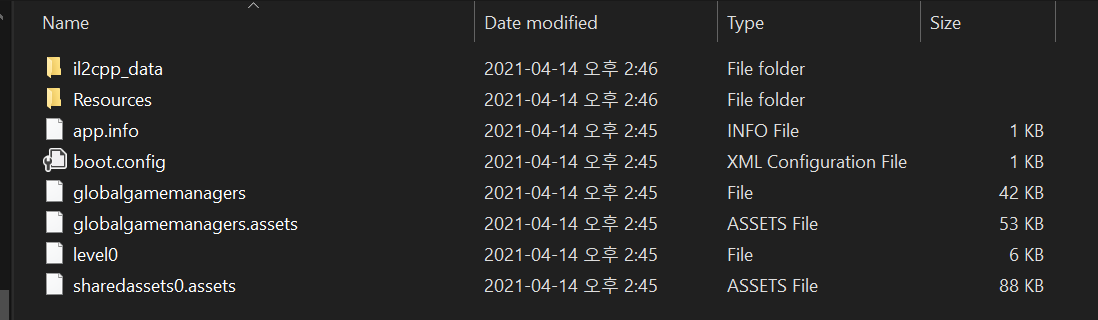 - Game_Data/il2cpp_data/... - il2cpp로 동작할 때 필요한 부가 데이터들