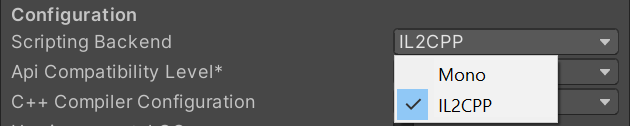 [프로젝트 설정 - 플레이어] 옵션에서 2가지 컴파일 옵션 중 선택할 수 있습니다. 기본은 mono로 선택되어 있으며 에디터에서의 컴파일과 동작은 항상 mono 기반으로 진행됩니다. IL2CPP 방식은 C#의 중간 언어 형태인 IL 코드를 CPP 코드로 바꾼 뒤 컴파일하는 방식입니다. mono로 빌드되는 경우 JIT 방식으로 컴파일되지만, CPP로 바꾼 뒤 컴파일하면 AOT 방식으로 컴파일됩니다. 성능상의 이점을 도모할 수도 있고, C# 코드로 원상복구가 쉬운 IL 방식의 배포보다 인간의 눈으로 식별하기 어려워진다는 부가적인 효과도 있습니다.