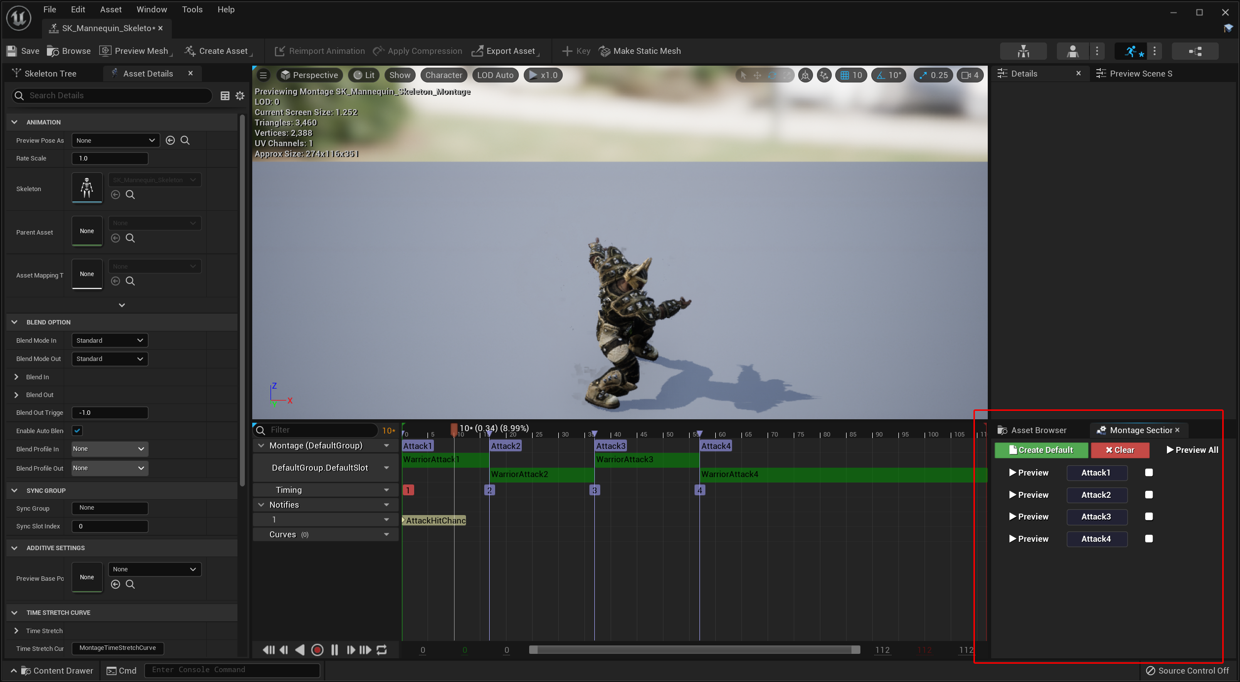 UE5에는 하단의 메인 패널에 있던 몽타주 섹션이 우측 하단 패널 별도 윈도우로 분리되어 있다.