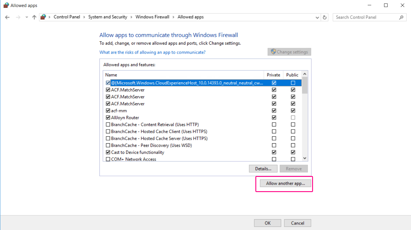 Allow another app... 버튼을 눌러 서버 인스턴스 실행파일을 등록합니다.