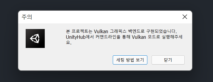 프로젝트 카야 에디터에서 강제 vulkan 모드로 지정하지 않으면 뜨는 대화상자